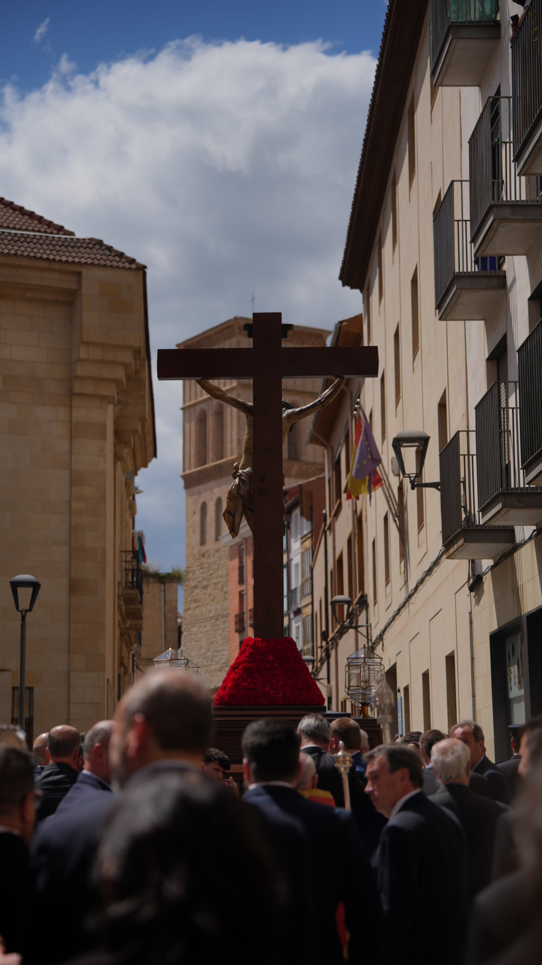 En 1944 el Cristo se guardaba en el interior del claustro de la Iglesia de Palacio y un grupo de devotos logroñeses, al conocer que existía esta valiosa joya, gestionó con las autoridades eclesiásticas su incorporación a la procesión de Viernes Santo. Para que figurase en la procesión fue preciso que varios hermanos donasen madera para las andas, otros una buena cantidad en metálico y, finalmente, diversos donativos que la junta recibió alborozada. De este modo, procesiona el Viernes Santo de 1945, sustituyendo al paso de la Crucifixión.